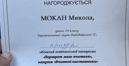 Вітаємо переможця фінального етапу обласної освітянської панорами "Портрет мого вчителя" учня 10- го класу Мокана Миколу, його нагороджено дипломом ІІ ступеня за роботу "Світоч для багатьох", напрям "Вчителі-наставники". Керівник: вчитель української мови та літератури Клейменова Н.І.